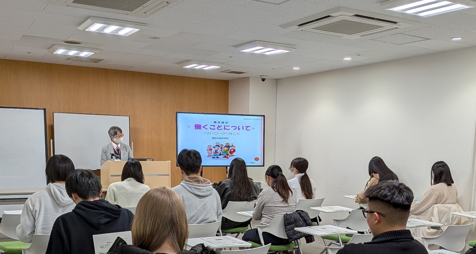 まずは、ハローワークの職員の方より、世の中には多くの種類の仕事があって、その仕事をどのように見つけるのかなどを説明していただきました。